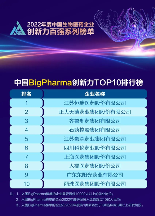 同日,2023米思会(中国医药健康产业共生大会)发布“2022年度中国生物医药企业创新力百强系列榜单”,AG真人平台医药再蝉联“中国BigPharma创新力TOP10”榜首。该榜单自2021年启动评选以来,AG真人平台医药稳居榜首。